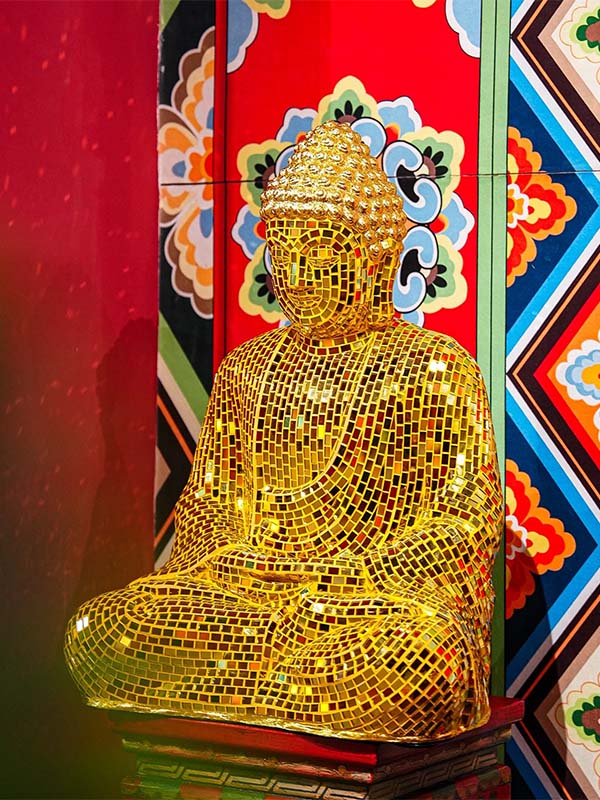 Handcrafted mirrored mosaic Buddha statue, suitable for meditation and spiritual spaces.