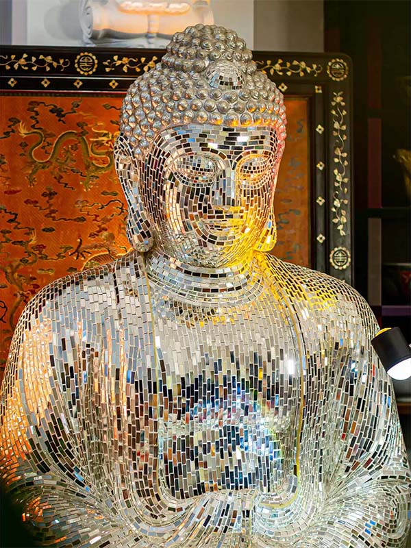 This mirror mosaic Buddha statue is suitable for B2B clients including hotels, designers, developers, and art sourcing companies seeking unique handcrafted art pieces with reliable factory production and export experience.