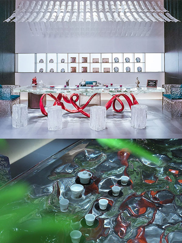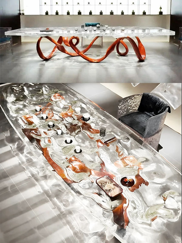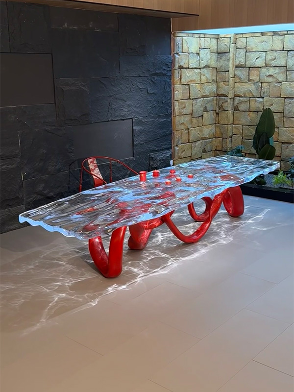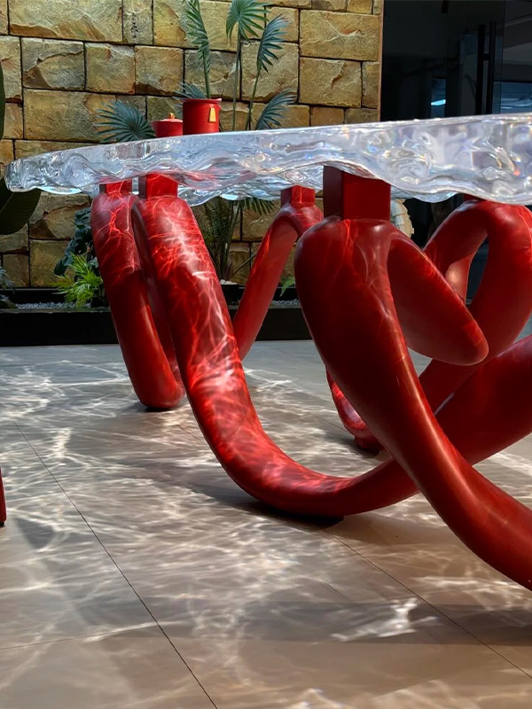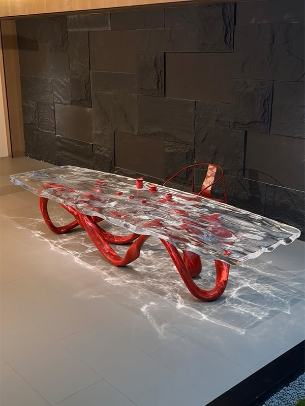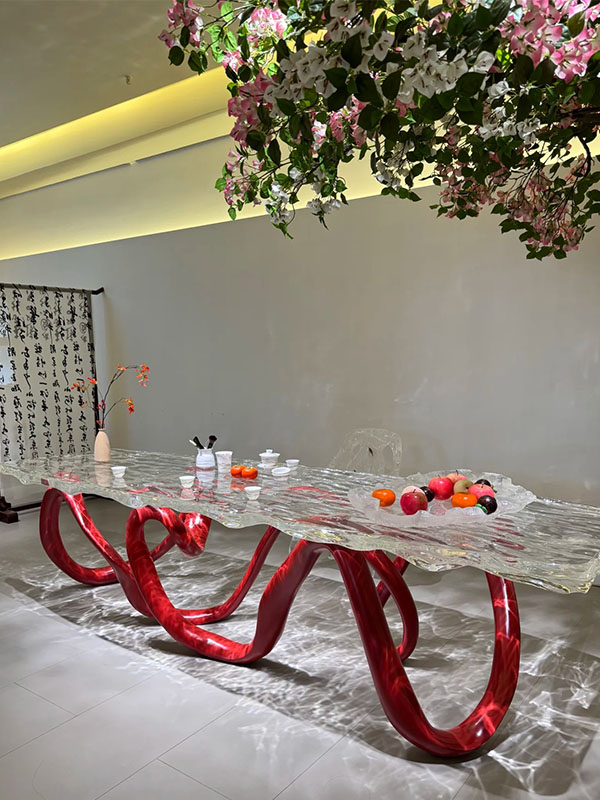 This custom art table is a signature piece that seamlessly combines Contemporary Sculptural Art with Functional Furniture. The tabletop is handcrafted from Transparent Resin, while the base features a bold Red Abstract Sculptural Form, creating a strong visual contrast and a dynamic sense of movement. The result is a striking focal point within any space.